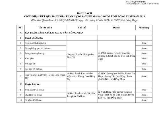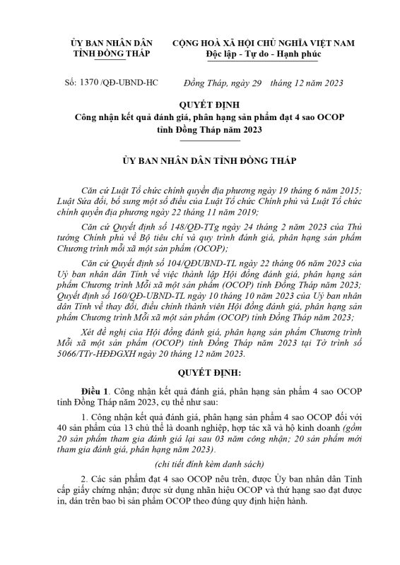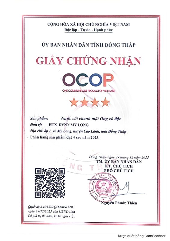 Hợp Tác Xã DVNN Mỹ Long xin được đính kèm quyết định số 1370/QĐ-UBND Tỉnh Đồng Tháp về việc công nhận đánh giá phân hạng sản phẩm đạt OCOP 4 sao.